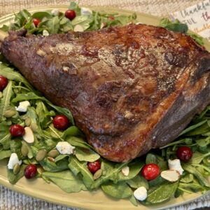 3. Rôtir : verser la sauce sur l’agneau. Couvrir d’une feuille d’aluminium et faire rôtir 2 heures et demie à 3 heures, en arrosant. Retirer le papier d’aluminium au bout de 30 à 40 minutes et badigeonner de glaçage.